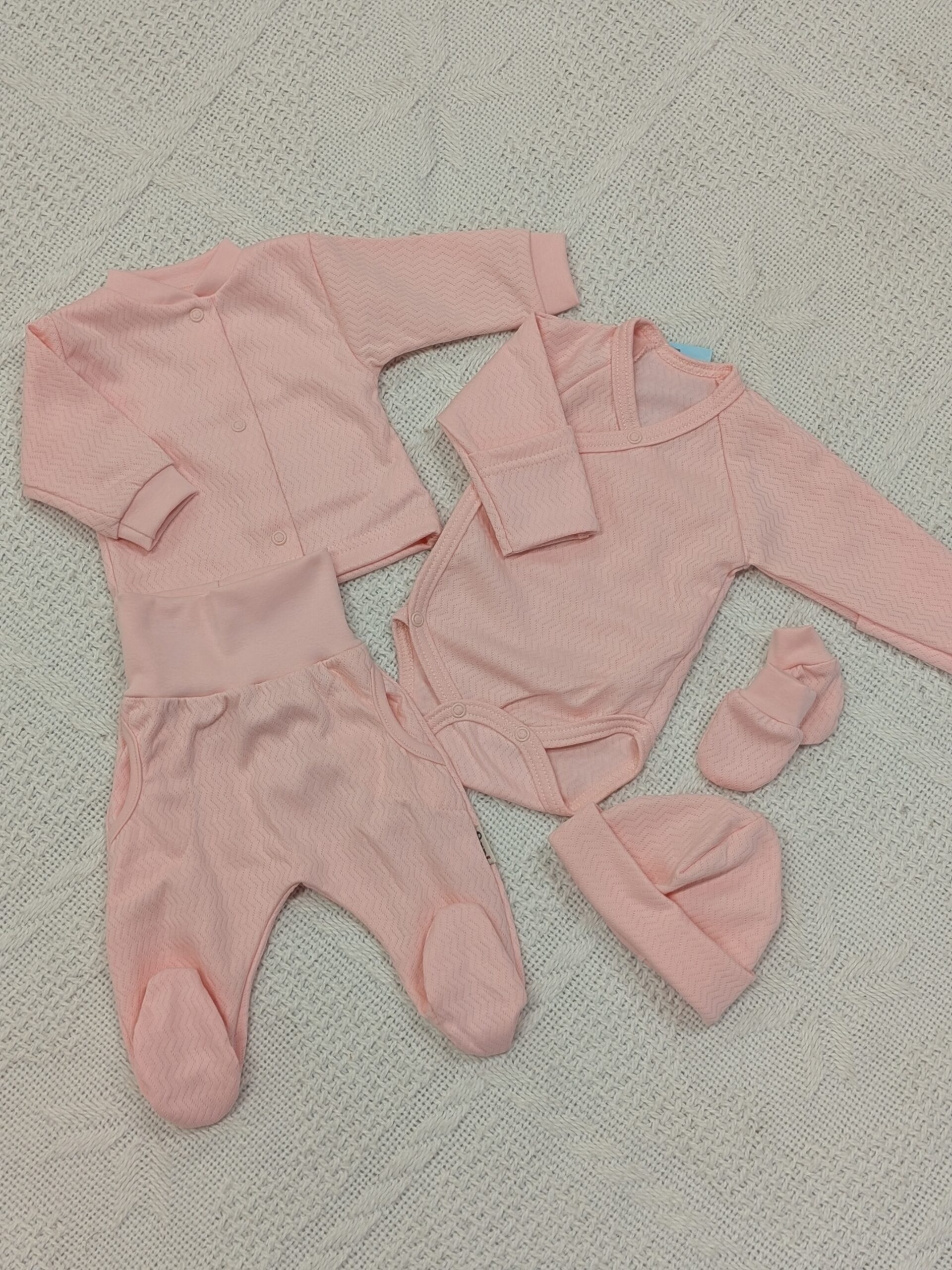 Komplektis: hõlmikbody, püksid, särk, beebimüts ja kindad.