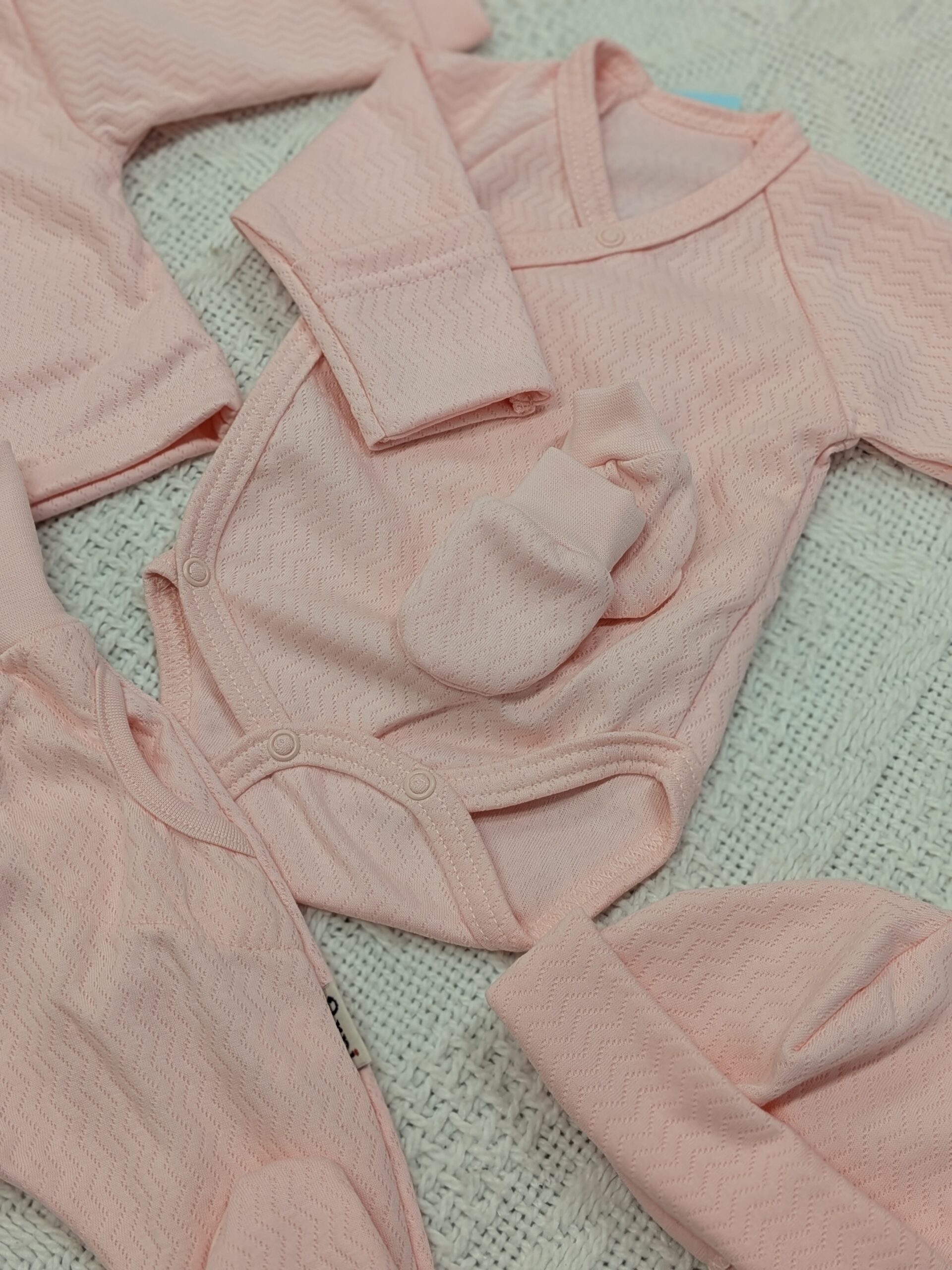 Komplektis: hõlmikbody, püksid, särk, beebimüts ja kindad.