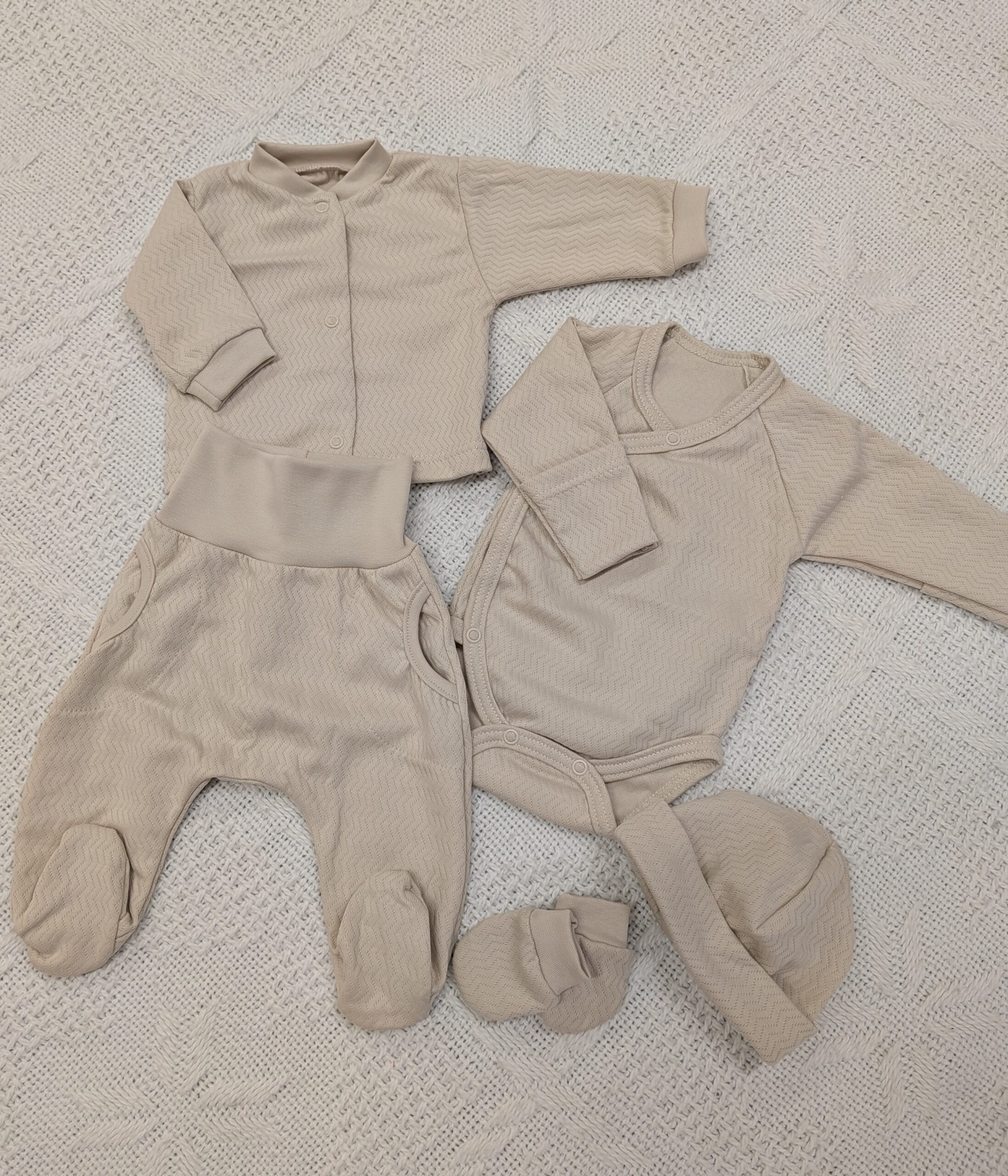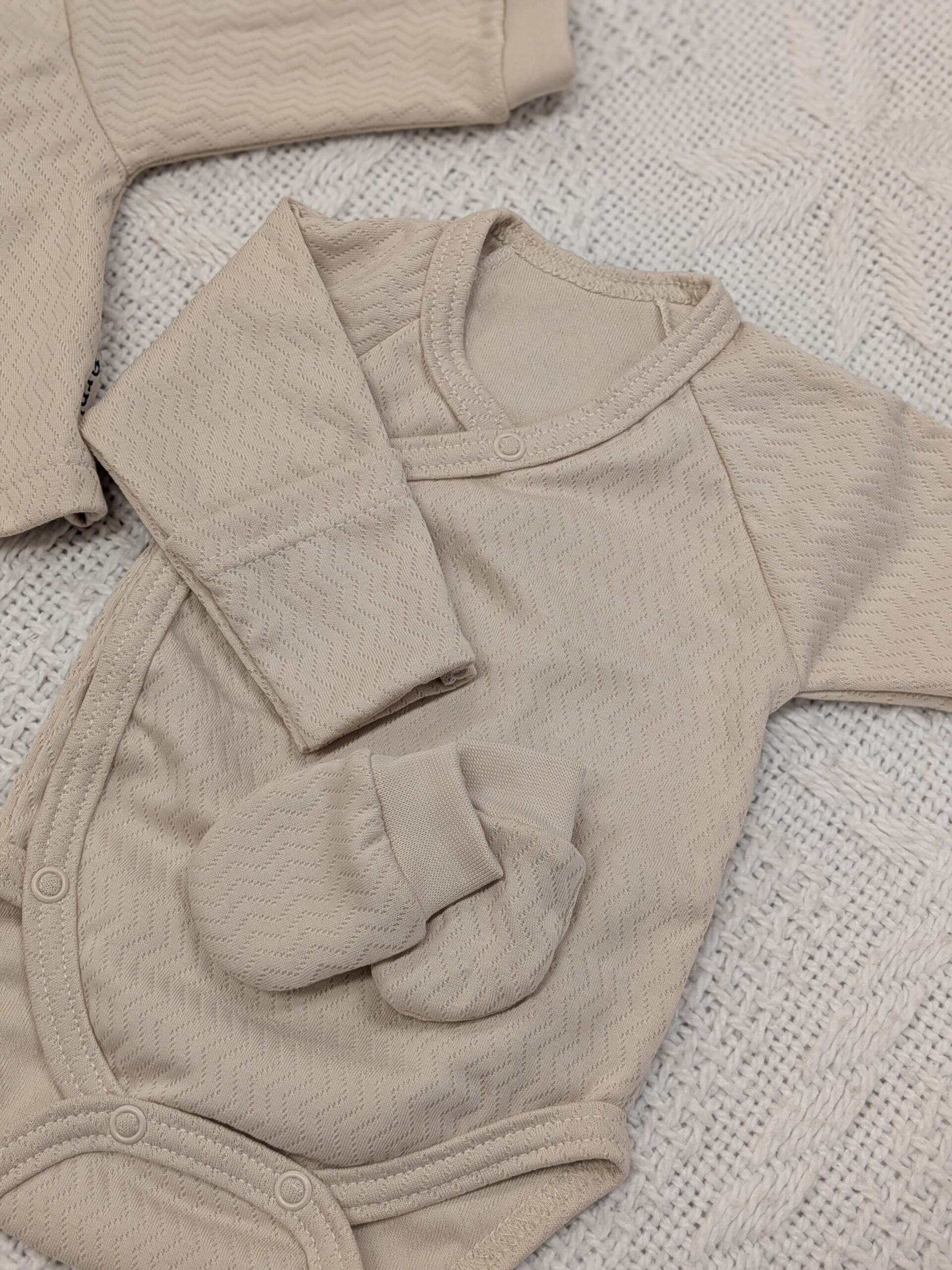 Komplektis: hõlmikbody, püksid, särk, beebimüts ja kindad.
